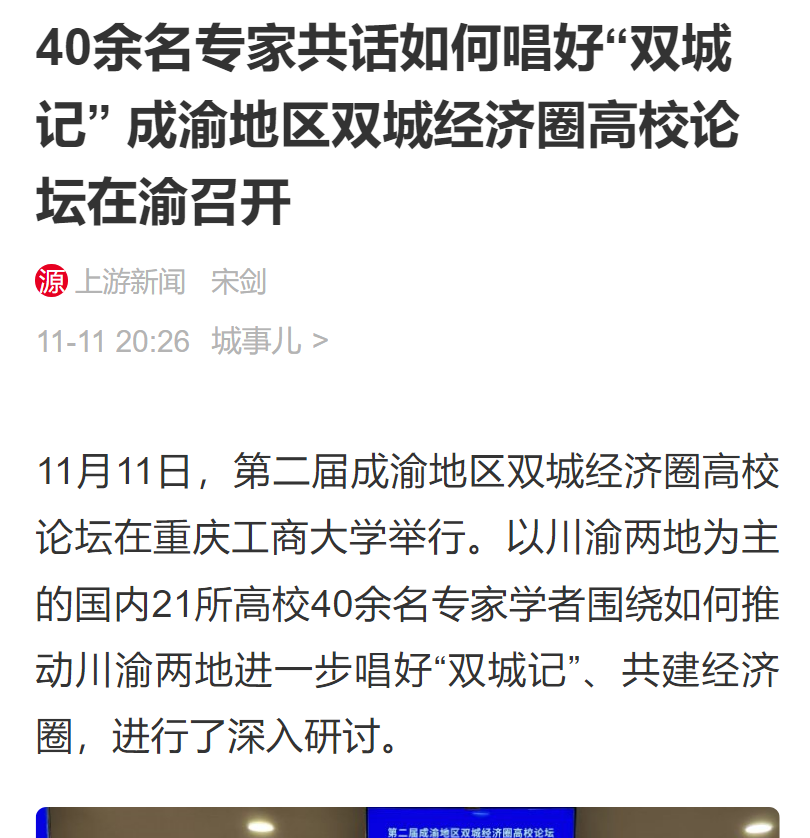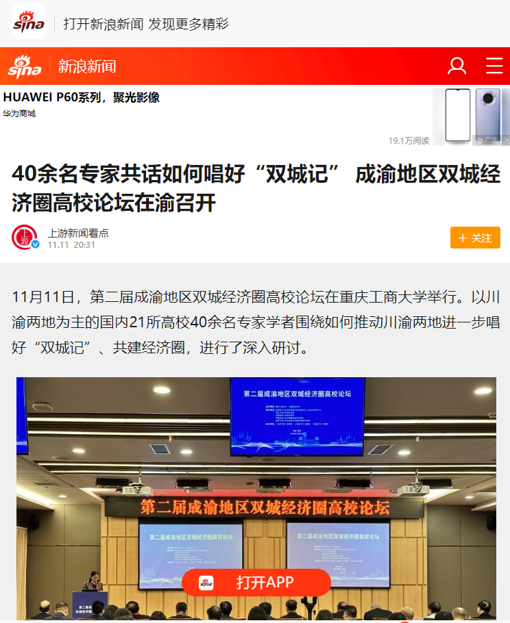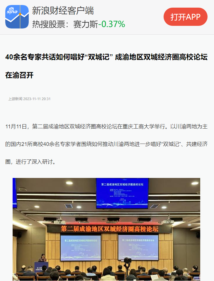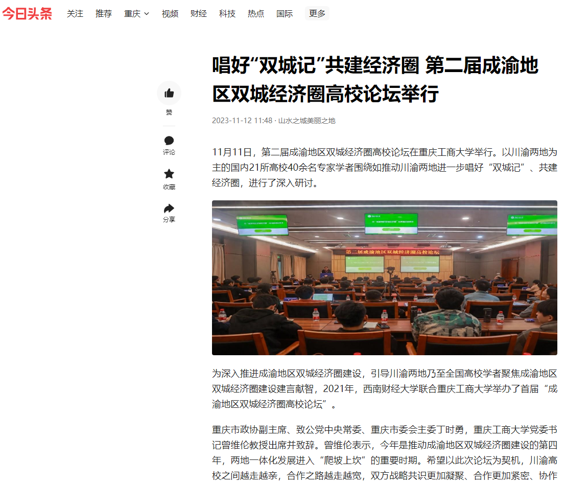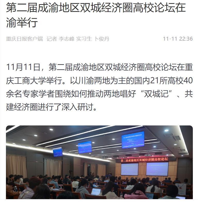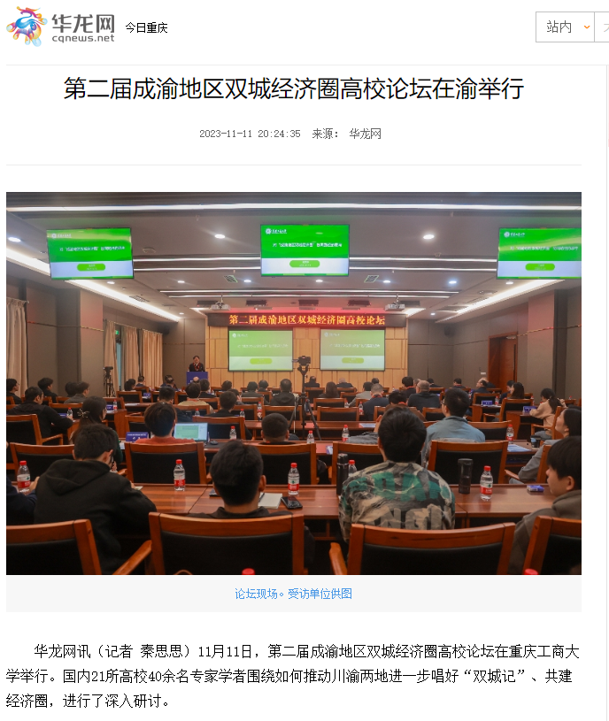 11月11日,由华体会体育·(sports)官方网站、西南财经大学主办,教育部人文社会科学重点研究基地长江上游经济研究中心、华体会体育·(sports)官方网站经济学院等单位联合承办的第二届成渝地区双城经济圈高校论坛在我校举办。重庆日报客户端、上游新闻、华龙网、今日头条等多家媒体对本次论坛进行了报道。