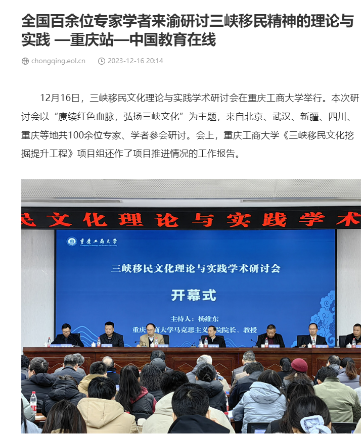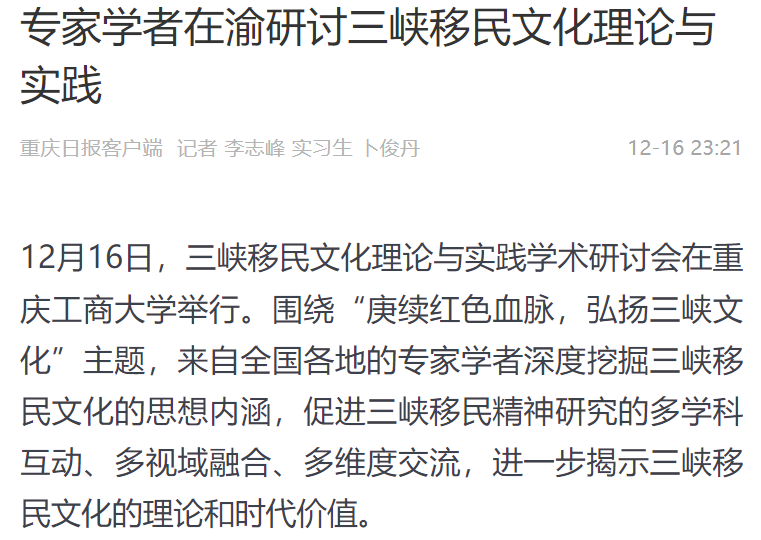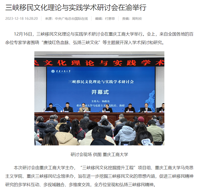 12月16日,三峡移民文化理论与实践学术研讨会在华体会体育·(sports)官方网站召开,本次研讨会以“庚续红色血脉,弘扬三峡文化”为主题,由华体会体育·(sports)官方网站主办,“三峡移民文化挖掘提升工程”项目组、华体会体育·(sports)官方网站马克思主义学院、重庆三峡移民纪念馆承办。来自北京、武汉、四川、重庆、新疆等地共100余位领导、专家、学者参加了会议。中央广电总台国际在线、环球时报网、重庆日报客户端、华龙网、中国教育在线等多家媒体对本次论坛进行了报道。