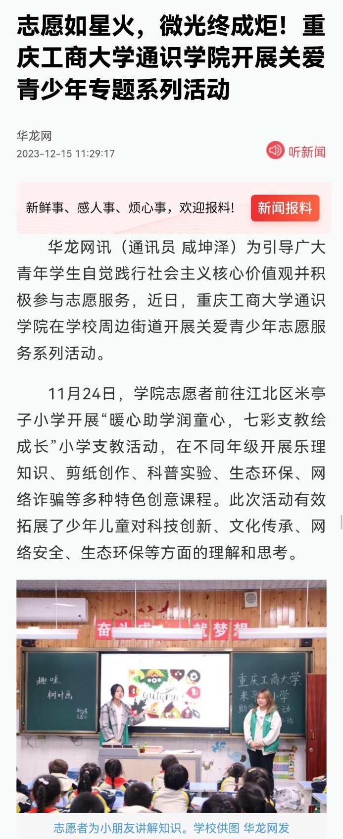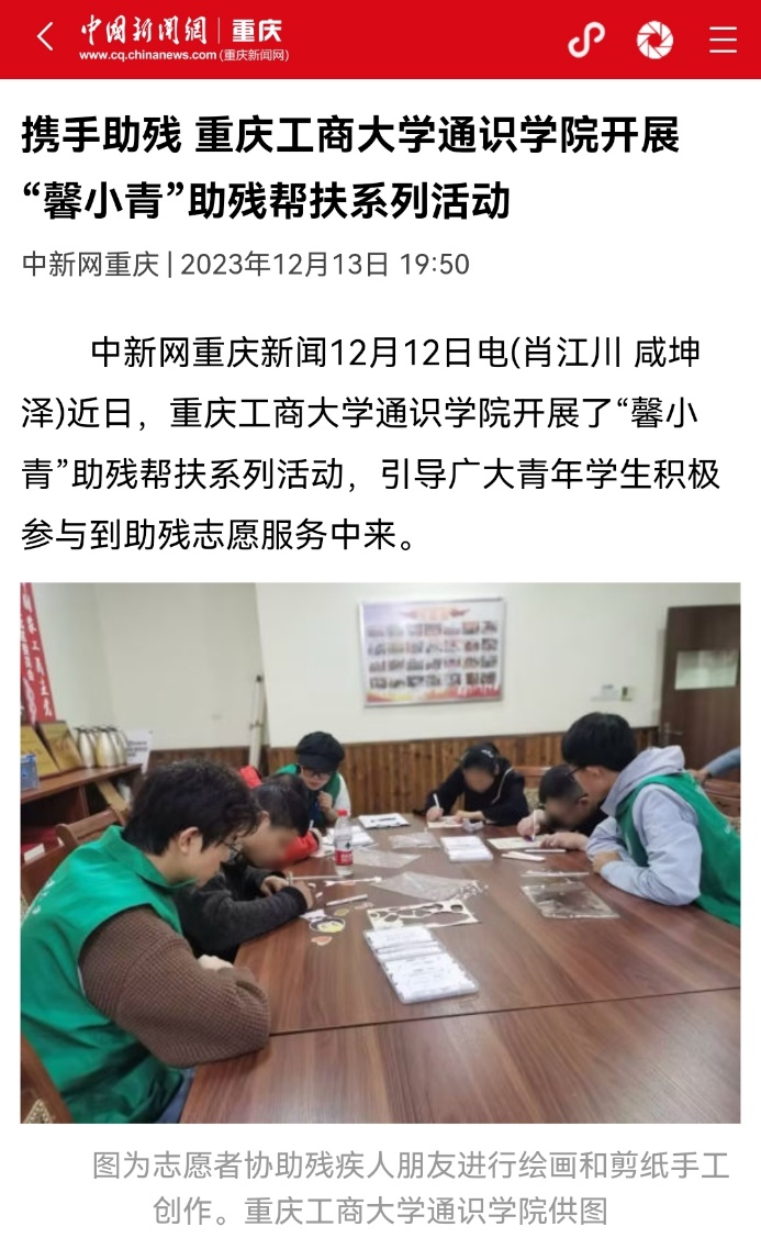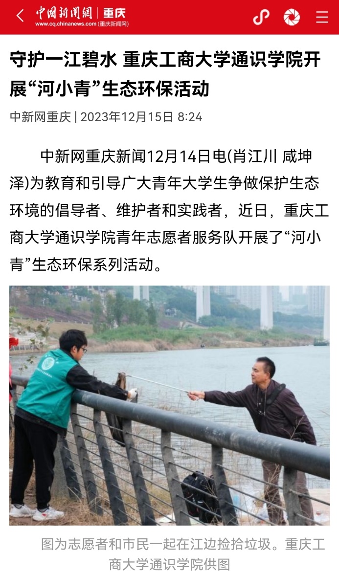 近日,中国新闻网以《守护一江碧水 华体会体育·(sports)官方网站通识学院开展“河小青”生态环保活动》《携手助残 华体会体育·(sports)官方网站通识学院开展“馨小青”助残帮扶系列活动》为题,报道我校通识学院开展生态环保及助残志愿服务活动;华龙网以《志愿如星火,微光终成炬!华体会体育·(sports)官方网站通识学院开展关爱青少年专题系列活动》为题,报道我校通识学院开展关爱青少年志愿服务活动。