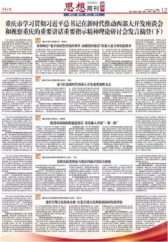 5月17日,《重庆日报》思想周刊刊登了我校党委书记曾维伦教授撰写的题为《深刻领会“毫不放松坚持党的领导、加强党的建设”的重大意义和实践要求》和党委常委、副校长李敬教授撰写的题为《奋力打造新时代西部大开发重要战略支点》的理论文章。