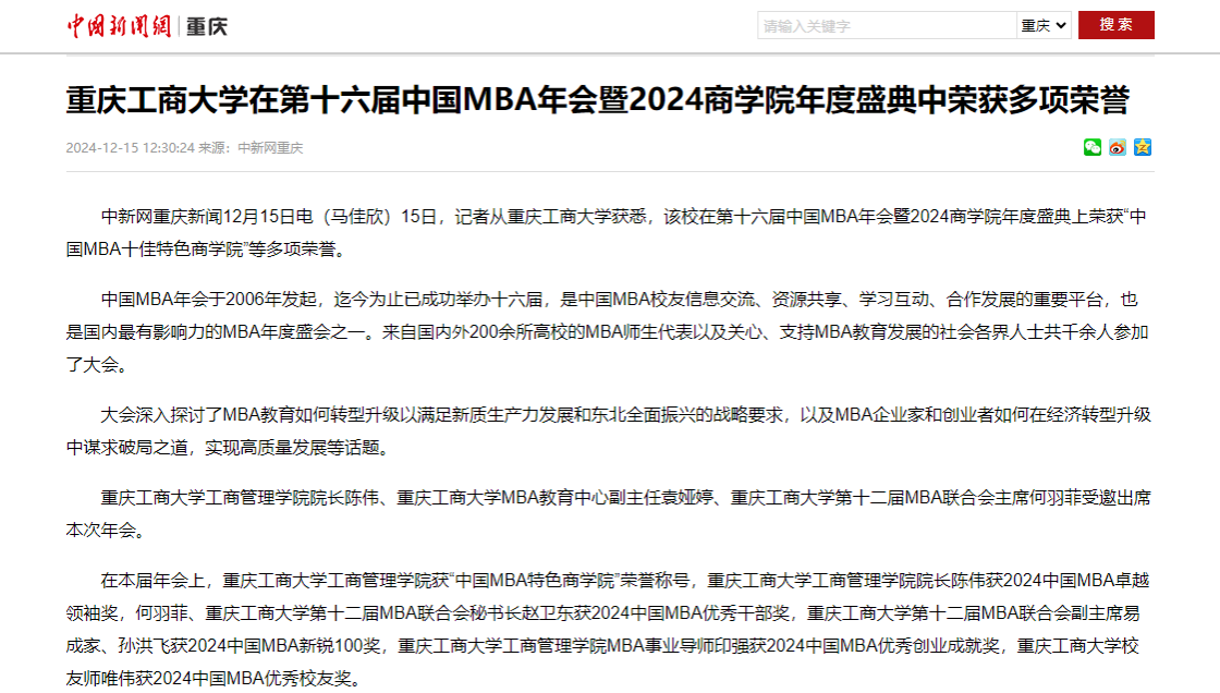 近日,中国新闻网以《华体会体育·(sports)官方网站在第十六届中国MBA年会暨2024商学院年度盛典中荣获多项荣誉》为题,报道我校在由大连理工大学主办的“智驭新质 商启未来 共襄振兴”——第十六届中国MBA年会暨2024商学院年度盛典中荣获多项荣誉。