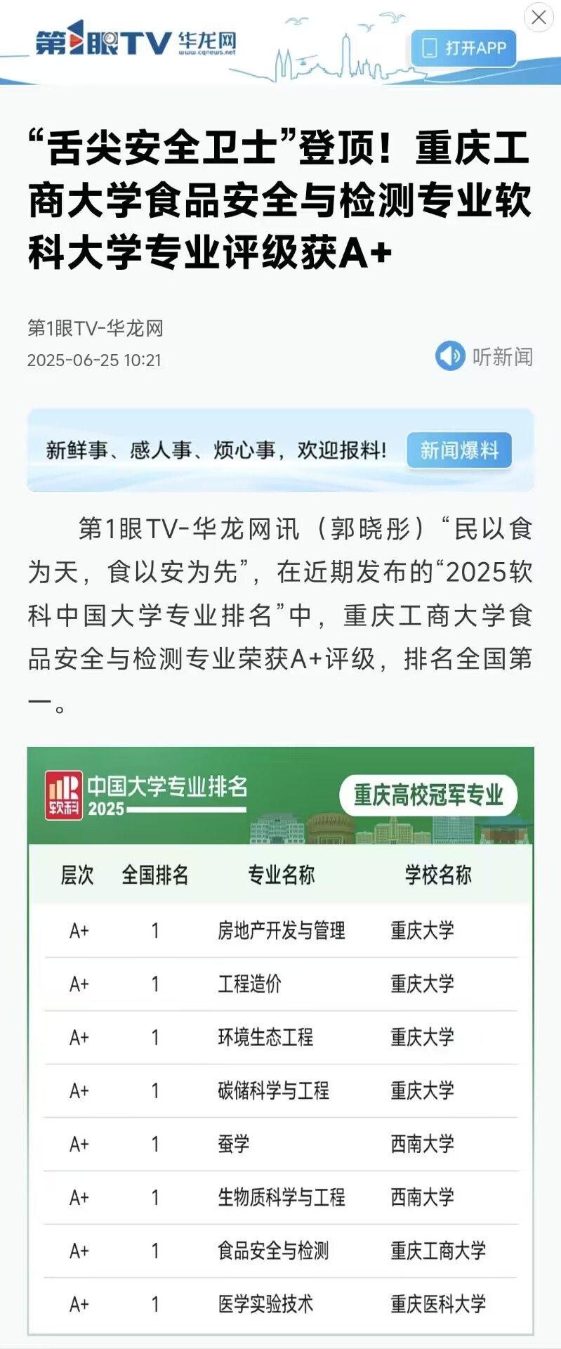 2.华龙网:“舌尖安全卫士”登顶!华体会体育·(sports)官方网站食品安全与检测专业软科大学专业评级获A+