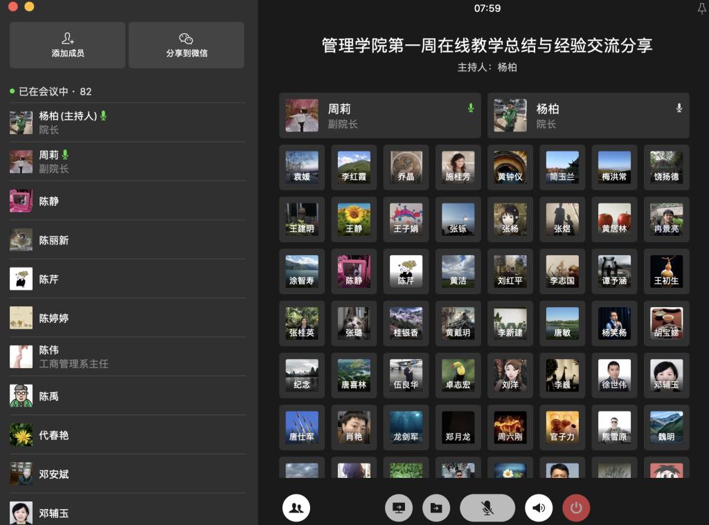 为及时发现教师在线教学中的问题,总结和交流在线教学心得、成功经验或典型做法,了解学生对教师在线教学的意见或建议,确保在线教学工作顺利开展,管理学院于3月6日下午在企业微信平台召开了在线开学第一周教学总结与经验交流分享会,杨柏院长主持会议,学院全体教职员工参加了会议。