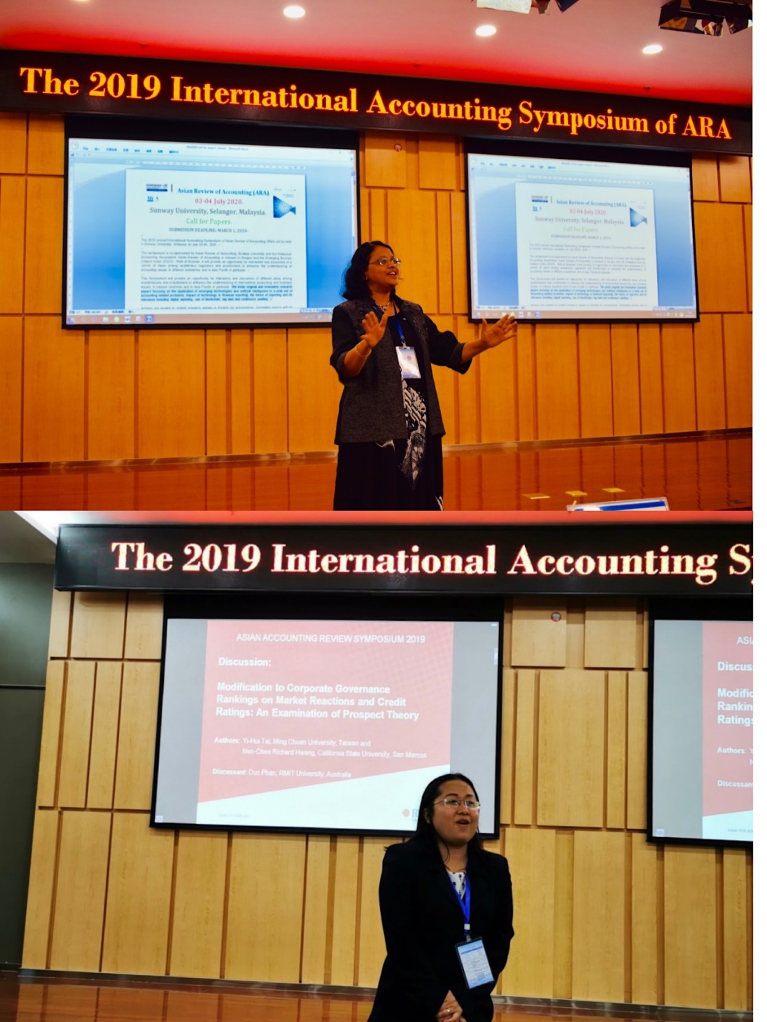 最后,下一届承办方澳大利亚皇家墨尔本大学的Duc Phan教授和马拉西亚双威大学、马拉西亚会计学会会长Susela Devi教授分别发言。他们首先对华体会体育·(sports)官方网站成功举办2019年亚洲会计评论学术年会表示祝贺,并对有机会承办2020年学术研讨会表示衷心的感谢。随后,Duc Phan教授和Susela Devi教授分别通过短视频方式对皇家墨尔本大学和双威大学进行了介绍,并诚挚邀请各位专家学者参加2020年的学术年会。