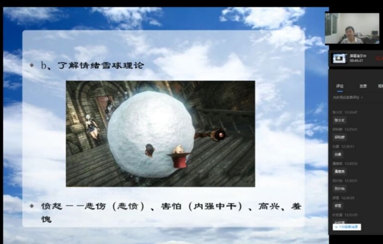 我校心理健康教育与咨询中心负责人胡佳怡老师在线主讲。胡老师从什么是情绪开始,让同学们知道了情绪的来源,并且详细讲解了“情绪雪球理论”,告诉大家要厘清我们的情绪,认识情绪背后的东西。她为同学们讲解了正确处理情绪方法——合理情绪疗法,它的核心是去掉非理性的、不合理的信念,从而改变我们的行为和情绪。胡老师还教给同学们一些日常调节情绪的有效方法。