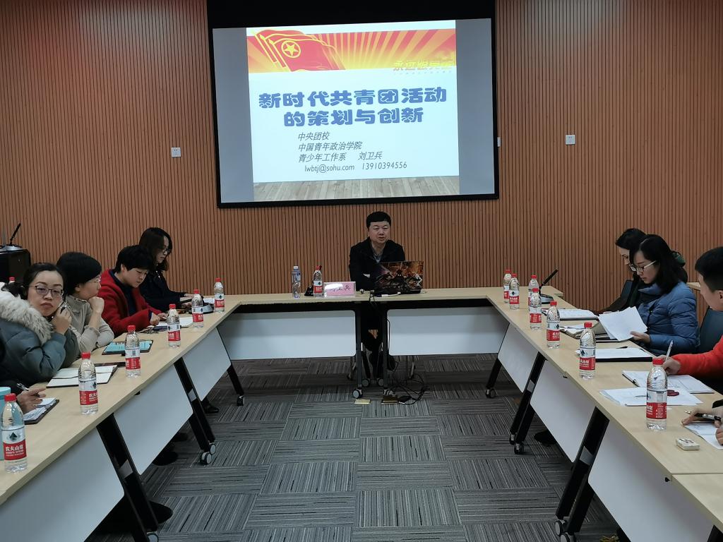 为深学笃用习近平新时代中国特色社会主义思想和学习贯彻党十九大精神,夯实“不忘初心、牢记使命”主题教育的思想基础和行动基础,巩固团务知识,建设一支积极向上、充满活力、坚强有力的团干队伍,做好青年学生“知心人”“热心人”“引路人”,12月5日下午,我校团委举办了团干专题培训,中央团校、中国青年政治学院刘卫兵教授做了《新时代共青团活动的策划与创新》,我校全体团干参与了此次培训。