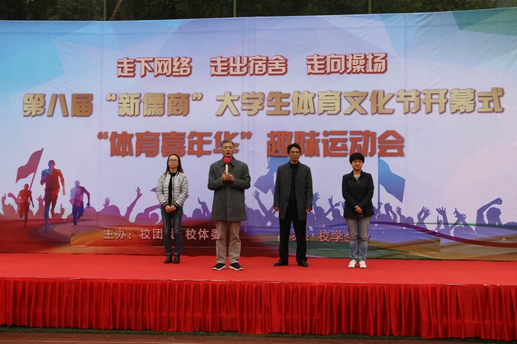 为响应共青团中央、教育部、国家体育总局、全国学联关于“走下网络、走出宿舍、走向操场”的号召,11月22日下午,第八届“新儒商”大学生体育文化节开幕式暨“体育嘉年华”趣味运动会在我校如期举行。本次运动会由校团委、校体委主办,校学生会承办,旨在增进各专业间同学的友谊,帮助同学们在学习之余放松身心,同时提高同学们的身体素质。副校长陈运超,校体委副主任、体育学院副院长范文杰,校团委书记杨娟,副书记陆嘉,以及1000余名学生参与活动。