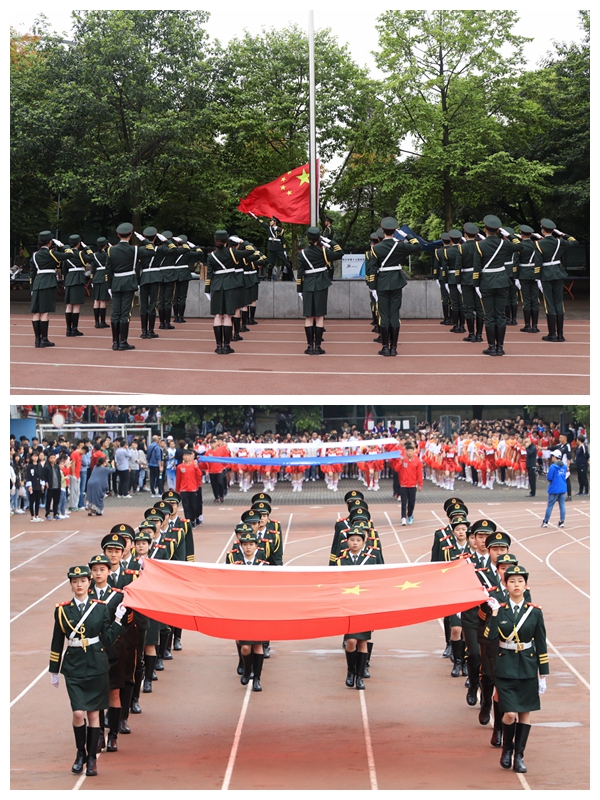 入场式上,国旗方队以饱满的精神、昂扬的身姿一马当先,展现了我校大学生良好的精神风貌。各学院代表队、机关工会代表队和学校教师舞蹈队依次入场。机械工程学院方队驾驶着学生汽车人团队自主研发的电动汽车,表现了机械人严谨求实,团结奋进的精神风貌;法学院方队身穿法官制服,怀揣法治梦想的他们,立志做法律忠实的传播者与实践者;艺术学院方队领学子身着cosplay服饰,展示了艺术学子的青春靓丽,勇于创新的艺术之心;社会与公共管理学院方阵前列是熊猫吉祥物,黑白两色是他们明辨是非、服务社会的理念,彩色气泡是他们夺目炫彩、激情洋溢的青春;会计学院方队最前列的创新方阵,直观展示了从结绳记事到人工智能的会计衍化历史,将千年会计文化凝聚于此……随后,教职工舞蹈协会带来扇舞,她们翩翩起舞,精彩绝伦;来自各学院的啦啦操宝贝和广播体操队进行了表演,欢乐的旋律、旋转的步伐、标准的动作,点燃了现场的激情。