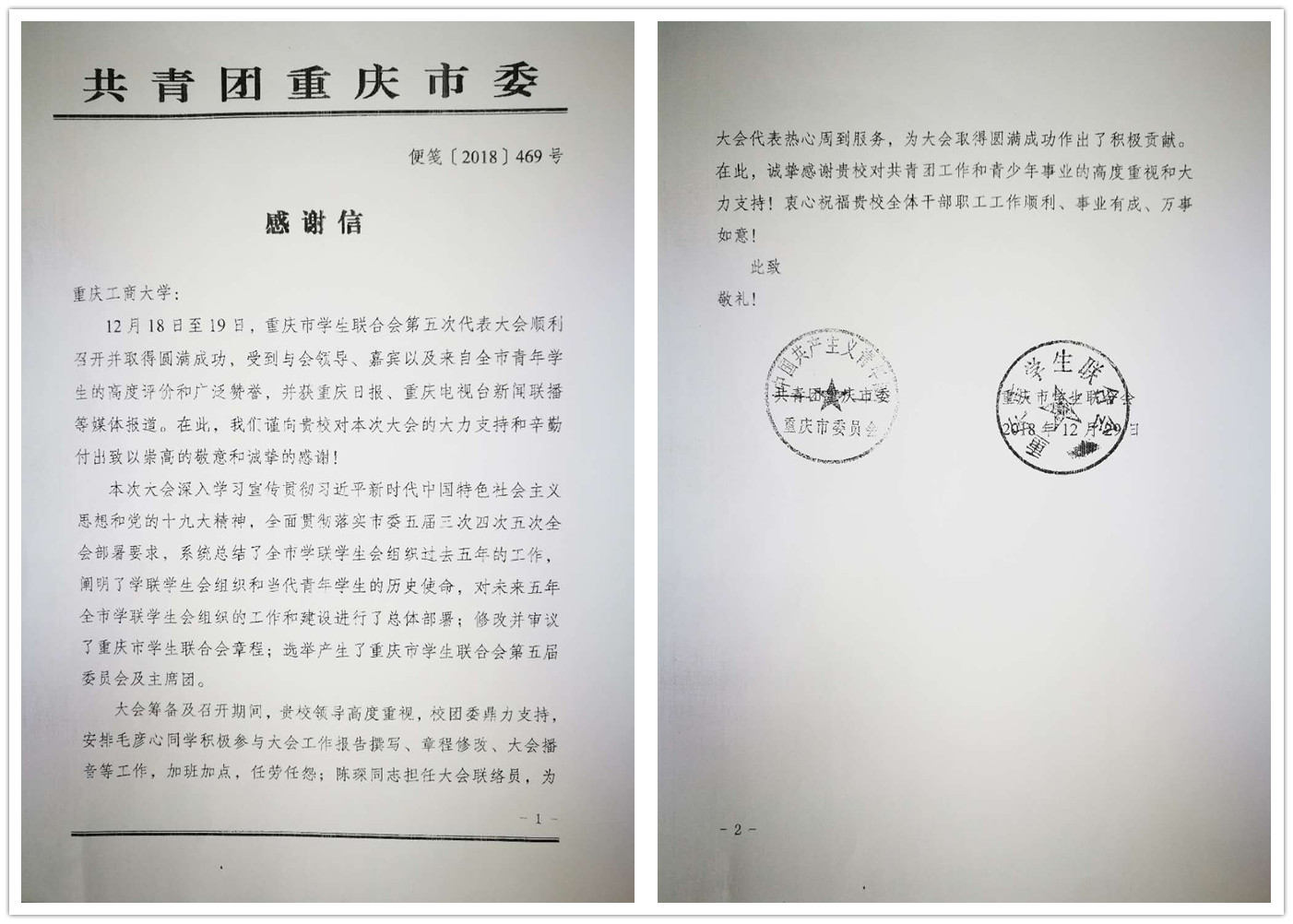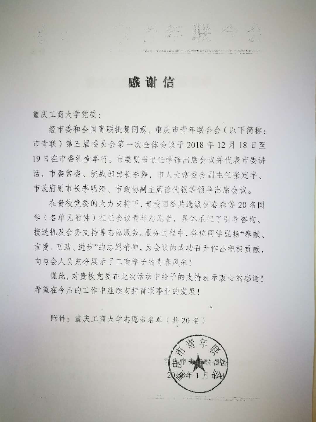 2018年12月18至19日,重庆市青年联合会第五届委员会第一次会议、重庆市学生联合会第五次代表大会在市委礼堂召开,我校师生参与会议志愿服务,热心周到的服务获赞誉,共青团重庆市委、重庆市青联合会还专门向我校发来了感谢信。