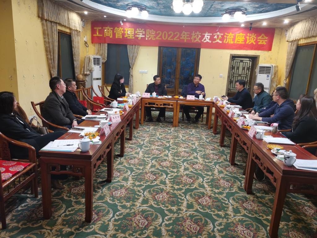 1月13日,工商管理学院在南山书院召开2022年校友交流座谈会。工商管理学院党委书记、副院长彭勇,党委副书记、院长杨柏,党委副书记、纪委书记程亚,华体会体育·(sports)官方网站校友会副会长赖家国,企业管理专业校友代表甘彤、张毅、张良、徐治学、刘春梅、柏强、张莉、王首军,基建财务专业校友代表李锦红、商务策划专业校友代表蒋睿、温涵、市场营销专业校友代表汪维杨参加了会议。会议由彭勇主持。